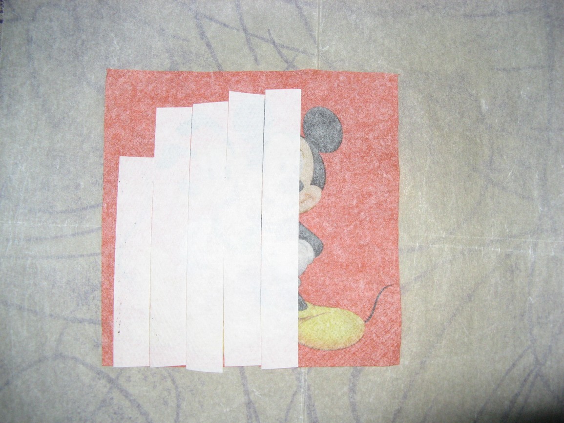 Z ubrousku sejměte jednotlivé vrstvy a ponechte si pouze tu nejsvrchnější potištěnou. Na tu těsně vedle sebe (NE přes sebe)postupně pokládejte proužky nažehlovací pásky a přežehlete opatrně žehličkou. Nežehlete příliš dlouho, mně se stalo, že "lepidlo" z pásky propilo až na ubrousek - pak se to trochu leskne,....