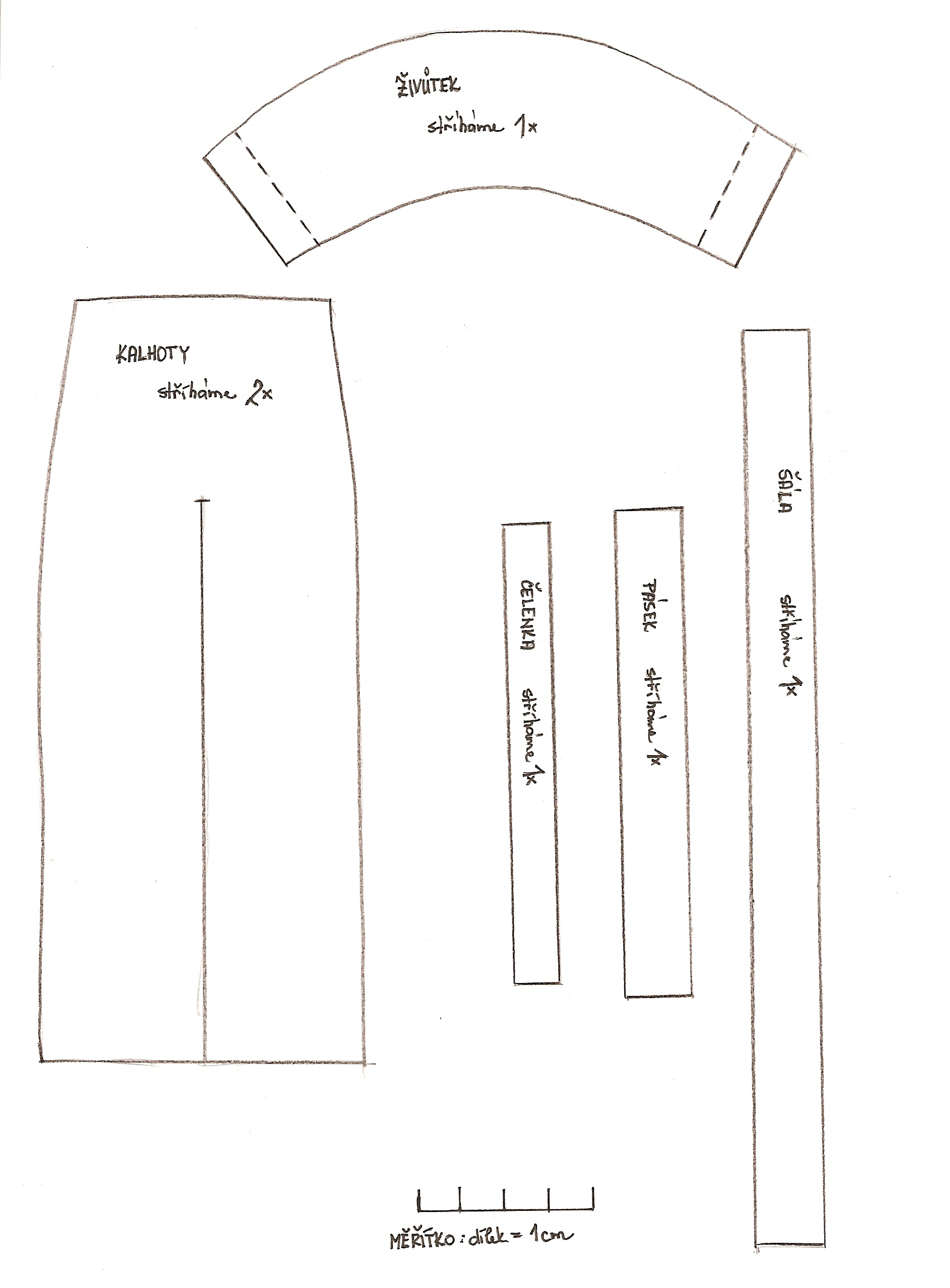Pracovní postup: U živůtku na zapínání použijeme suchý zip, který našijeme na oba konce - šíře 1 cm, a to z protilehlé strany. Díly kalhot přiložíme lícem k líci a sešijeme boční švy a jednotlivé nohavice. U pásku vystřihneme knoflíkovou dírku a přišijeme knoflík. Na čelenku našijeme na oba konce, vždy z protilehlé strany suchý zip - ten můžeme použít i u pásku místo knoflíku. Šálu jen vystřihneme a je hotová. Všechny okraje u kalhot, živůtku, pásku i čelenky necháme jen tak bez začištění jelikož flauš se netřepí a i tak to vypadá hezky.